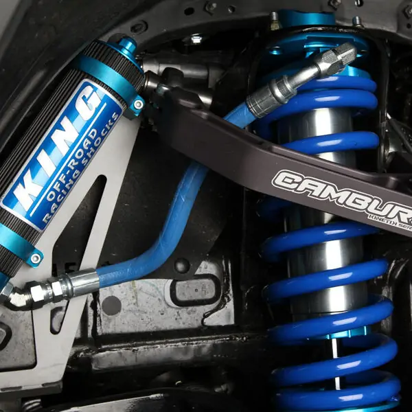 Using larger and stronger FK 7/8” chromoly heim joints allows for additional camber and caster adjustment if needed. Using a heim joint also eliminates flexing/deflection under hard use and braking with zero binding when in use. Using AN/Mil-spec hardware we have a single pinch bolt and secondary jam nut to insure the heim is secure with the rigors of off-road use. These heims are considerably stronger than the smaller & cheaper versions many competitors use.