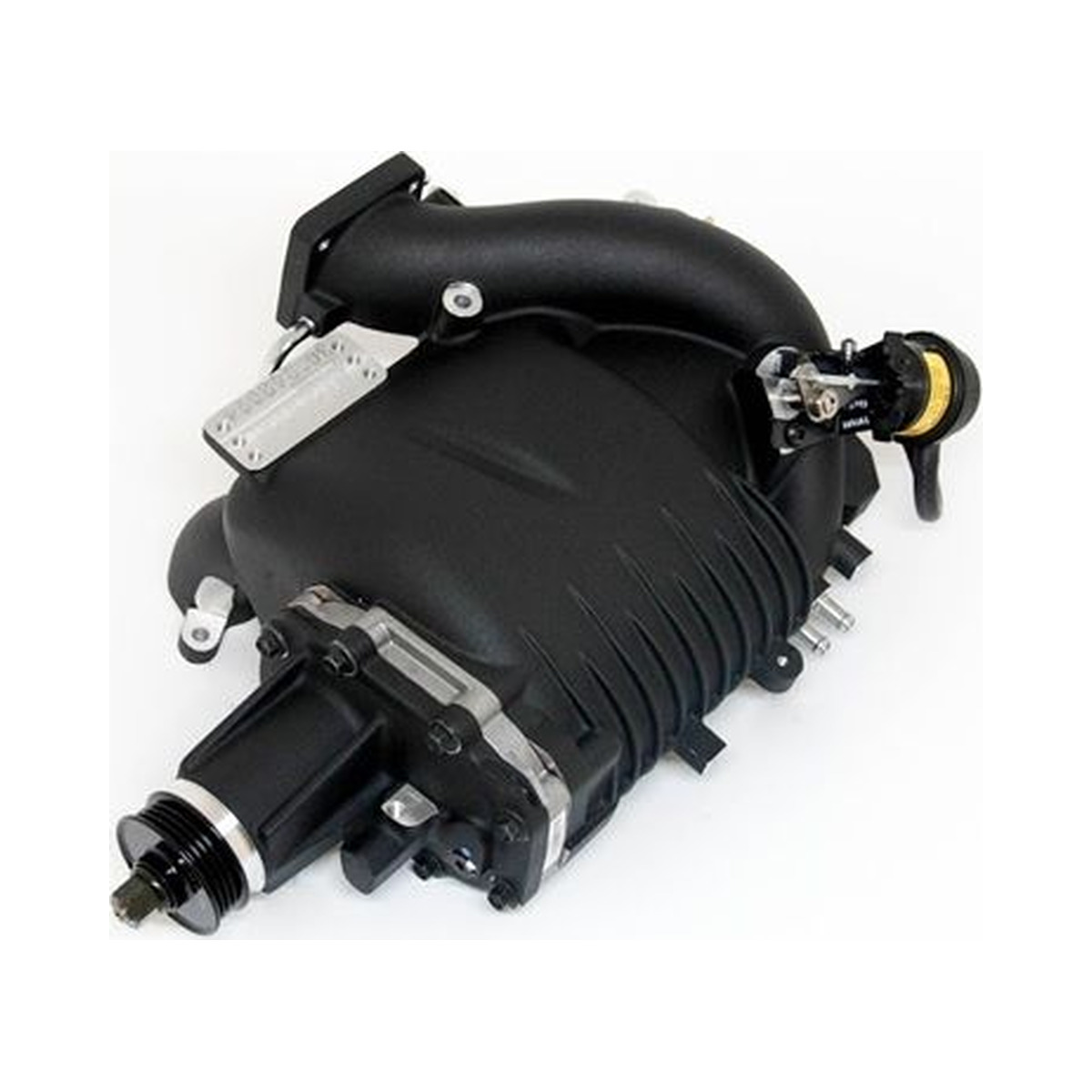 The single cast unit and appropriately sized rotating group eliminates potential leak points and allows for a slim, compact design without sacrificing key airflow design characteristics. The unit features a high velocity flow path through the supercharger rotors and an unrestricted discharge port into the appropriately sized plenum. The large plenum equalizes flow across all ports as air feeds evenly into the runners. Finally, the ports are separated into individual runners, offering greater operation by eliminating cross-fire.