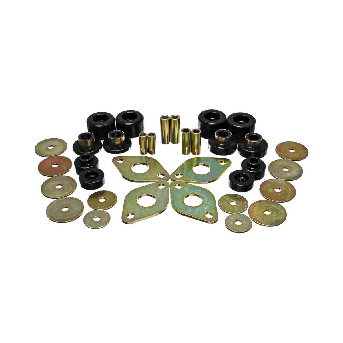 The Energy Suspension Body Mount Set fits 2001-2004 Toyota Tacoma. Key configuration details include Black Hyper-Flex performance polyurethane construction and Standard Cab / Xtracab. It is designed to restore body-to-frame alignment with greater durability than stock rubber mounts.
