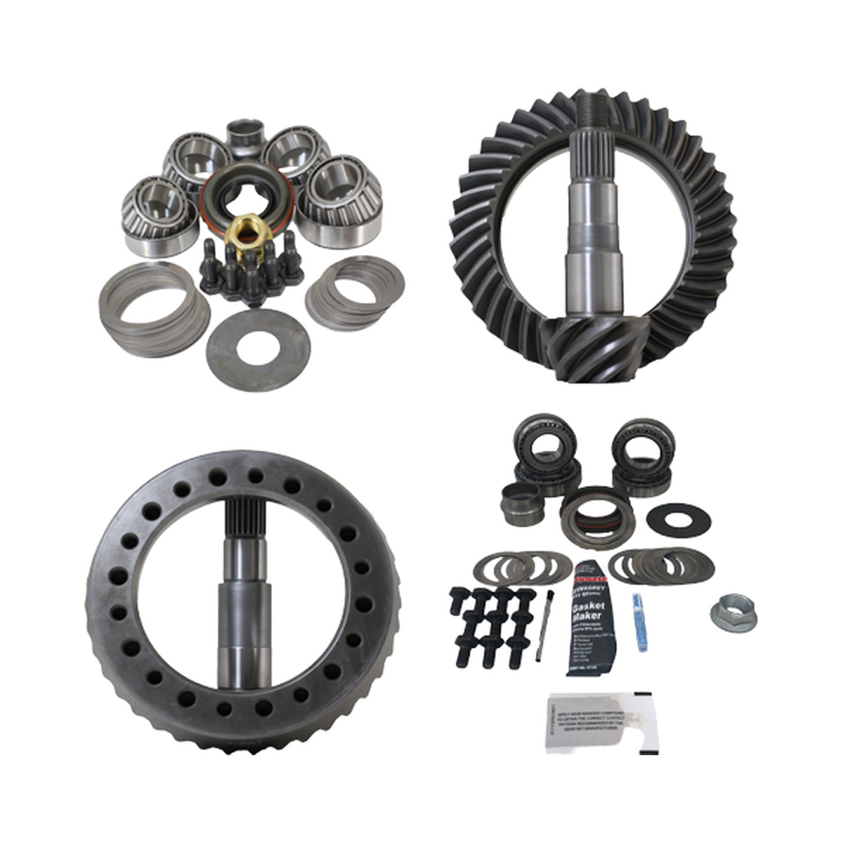 Revolution Gear sets are made from top quality 8620 Steel and are precision heat treated to OEM specifications, making for the best aftermarket gears available. All Revolution Ring and Pinion sets are backed by an industry leading 2 Year Warranty against defects. Revolution gears are also double, and in some cases triple lapped for flawless setup, smother running and longer life. With products that have been Street, Off Road and race proven for more than a decade, you can count on Revolution Gear and Axle products to be the best aftermarket parts available. Revolution Gear and Axle Master Overhaul Kits come with all the necessary parts to re-Bearing your differential and install a new ring and pinion set. Revolution master Overhaul kits come with top quality Timken Bearings and National seals. Along with new Timken Bearings kits include Pinion seal, Pinion Shims, Carrier Shims, Pinion Nut, Gasket or Sealant, Preload shims or Crush sleeve, Ring gear bolts, Gear marking compound and Loctite for the ring gear bolts.