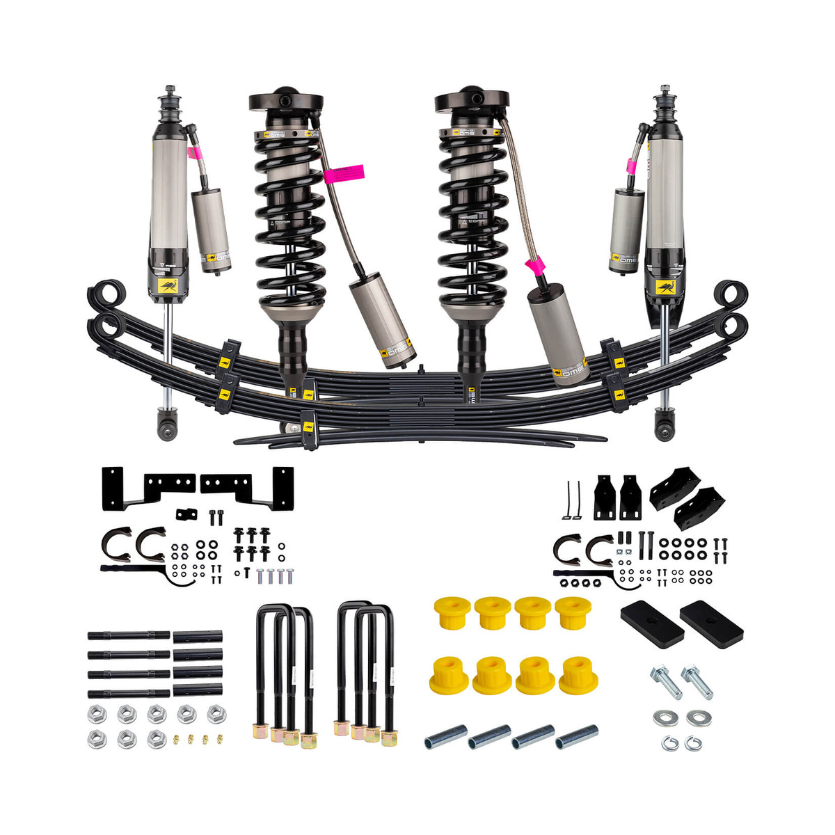 Old Man Emu offers a range of tuned and matched integrated suspension kits to ensure the right suspension is selected for how the vehicle is outfitted and the conditions it will encounter. Old Man Emu suspension systems are designed to enhance ride quality, ride control, load-carrying capacity, and ride height. When building an off-road vehicle, it’s best to notate the heavy parts that you plan to add. Heavy components will slowly begin to compress your suspension which results in vehicle sag. Choosing an Old Man Emu integrated suspension kit will avoid sag and ride discomfort as our engineers have tuned and matched suspension components for a range of different weights. Old Man Emu has an offering of 3 different shock absorbers to ensure that you can find an integrated suspension kit to suit your every demand, vehicle outfit and road condition. This suspension lift kit comes with Old Man Emu BP-51 shocks. Utilizing the latest off-road technology, the BP-51 is a user adjustable internal bypass shock absorber. With 10 levels of compression and 10 levels of rebound adjustment, BP-51 delivers unmatched comfort and control ; both on and off road. This suspension lift kit is tuned and matched for the Toyota Tacoma to provide 2in of lift in the front, with a weight of 0-330lbs and provide 2in of lift in the rear with a weight of 660lbs. ;