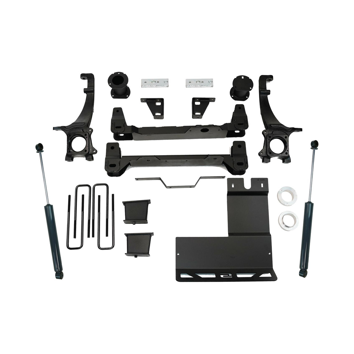 This kit includes front knuckles, front strut spacers, cross-members, belly pan skid plate, bump stop brackets, a rear block and u-bolt kit, and rear shocks. All require parts are included to make sure your Toyota Tacoma rides and handles just like stock.