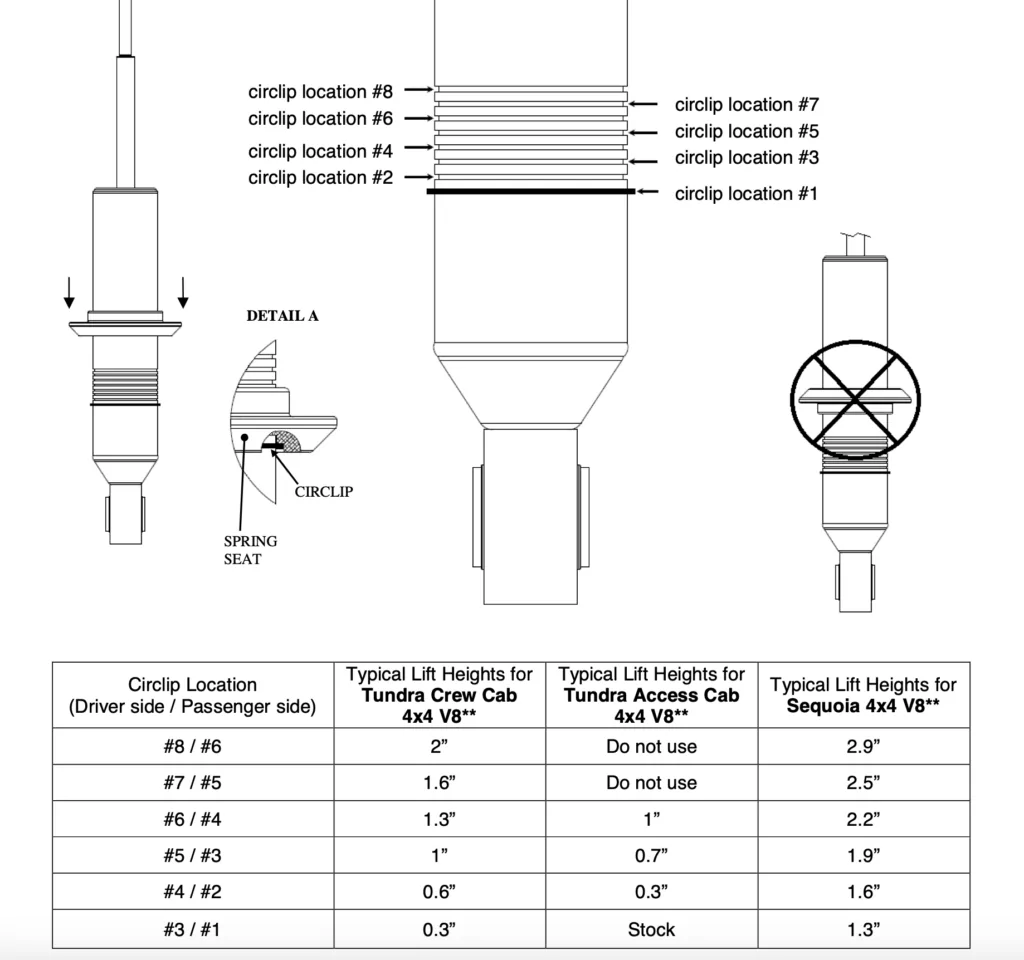 For B6112 kit the chart says not to use the top 2 circlip settings for 2000 Toyota Tundra Accesscab 4x4, but they are available for crew cab and Sequoia. Is this to prevent over stiff suspension? I’m hoping for the full 2.75 - 3” lift height. What kit would you suggest for this? I’m planning to run an aftermarket front bumper, Is there any variation in that recommendation for weight?