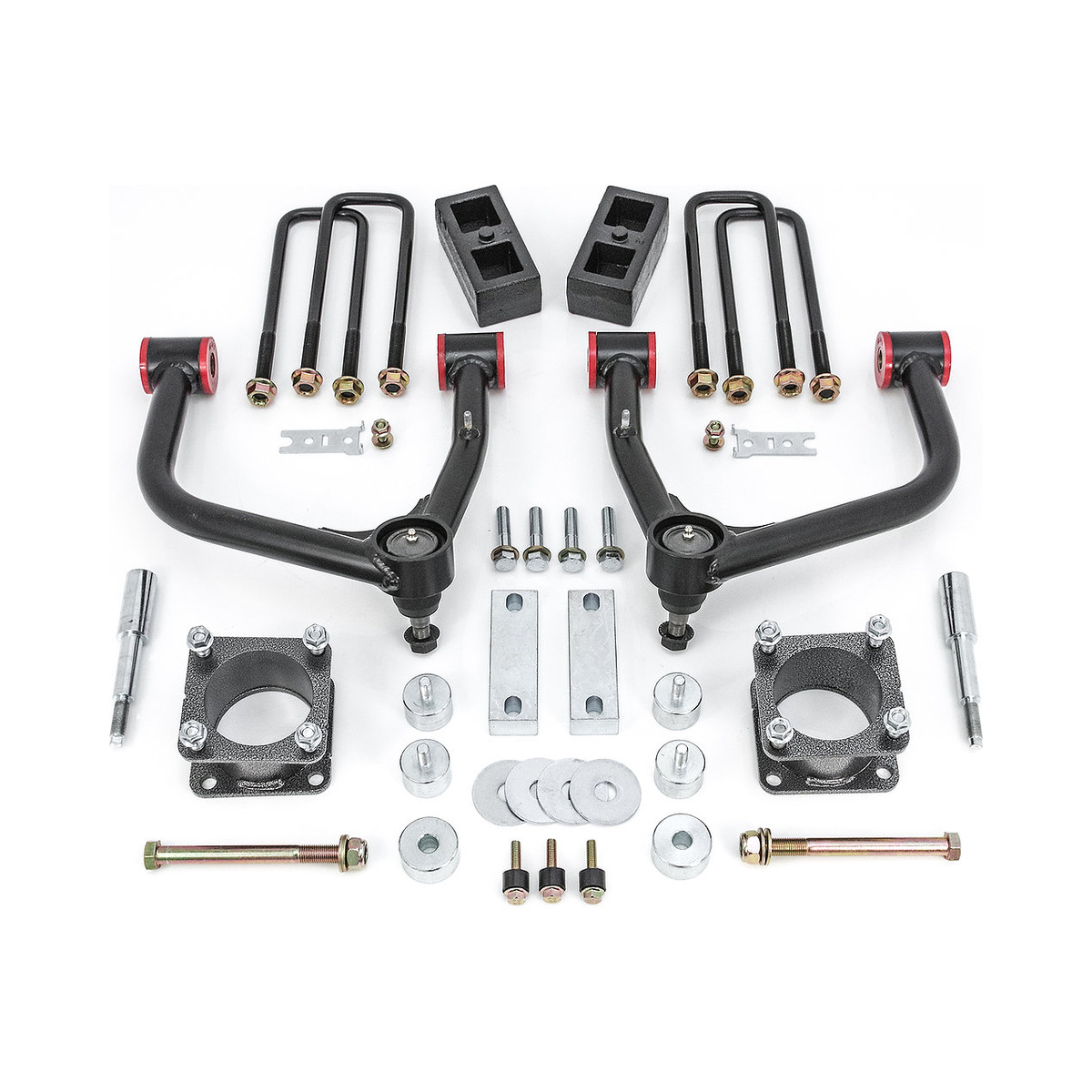 The Rugged Offroad 75-547554 inch lift kit includes heavy duty steel front strut extensions and heavy duty tubular steel upper control arms designed around 4 inches of front lift geometry. This kit includes new sway bar drop brackets, rear shock extensions and front bump stop extensions to keep the front suspension performing like stock. CNC machined billet front differential drop spacers are also included to properly lower the front differential to help correct front CV axle angles.