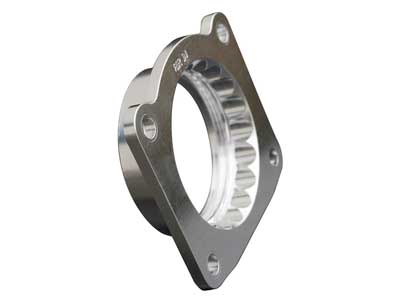 Silver Bullet throttle body spacers create turbulence in the air flow at the point just prior entry into the engine increasing horsepower, torque and improving throttle response and fuel efficiency. Silver Bullet throttle body spacers are constructed out of durable T-6061 billet aluminum and using a unique serrated/helix entry to create turbulence at the manifold while eliminating the annoying whistle found in other helix only throttle spacers.